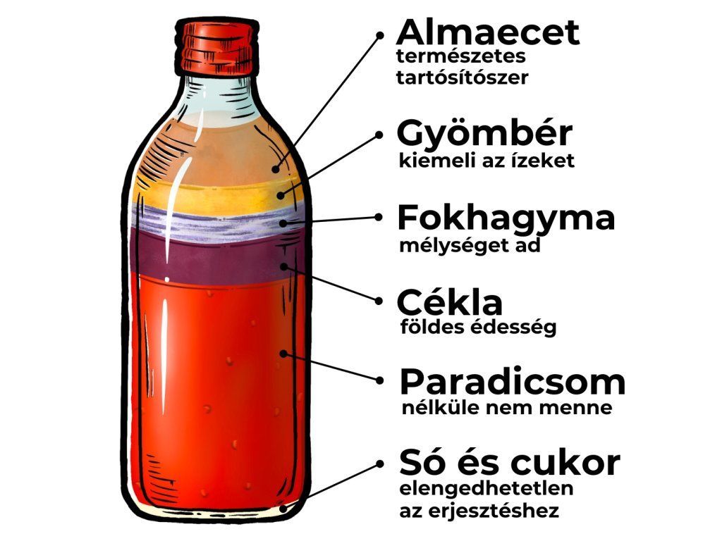 - Összetevők: erjesztett szitált paradicsom, almaecet, cékla (11%), cukor, só, gyömbérlé, fokhagymalé