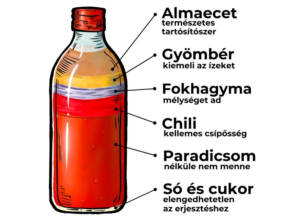 - Összetevők: erjesztett szitált paradicsom, almaecet, cukor, só, chili pelyhek 2%, gyömbérlé, fokhagymalé, chili