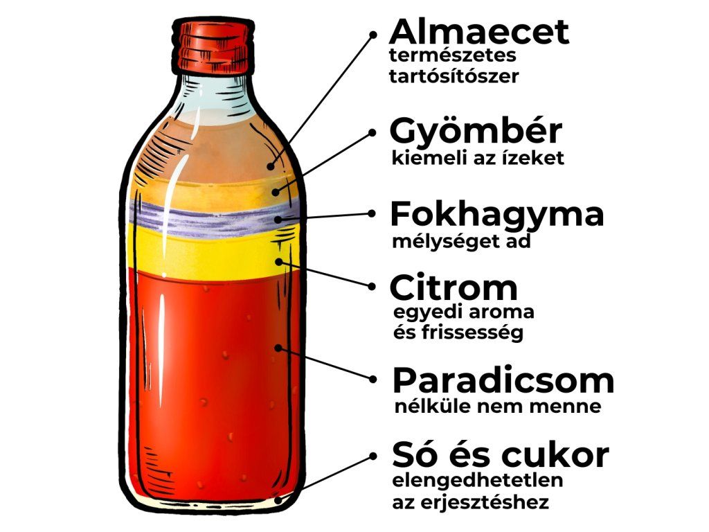 - Összetevők: erjesztett szitált paradicsom, almaecet, erjesztett citromlé 7% (citrom 88%, víz, só), cukor, só, gyömbérlé, fokhagymalé