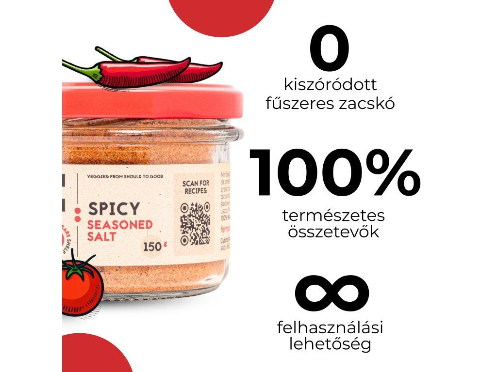 Tartalmaz chilipelyhet, amely kellemes pikáns ízt ad. A konyhában szinte mindenhez felhasználhatja – a húspácoltól kezdve a grillezett zöldségeken, salátakeverékeken át egészen az szószokig, amelyek a Spicynek köszönhetően teljesen új dimenziót kapnak.